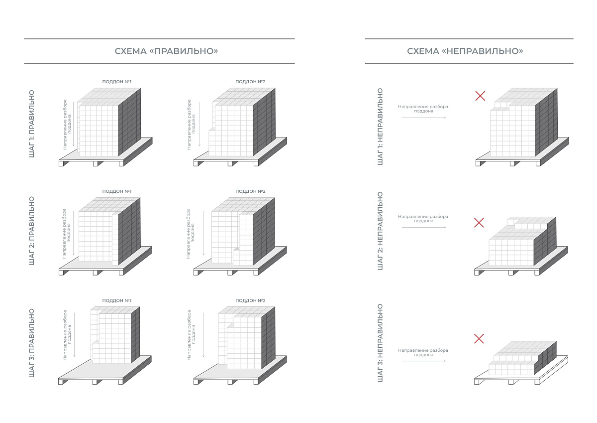 Для создания равномерного цвета покрытия и достижения наилучшего эстетического изображения разборку транспортных поддонов с плиткой следует производить поштучно по вертикальным рядам, поочерёдно из трех поддонов и более (см. на схеме «Правильно»).